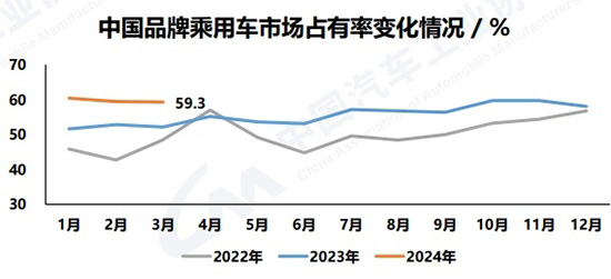 在乘用車市場(chǎng)中,中國(guó)品牌市占率持續(xù)提升。中國(guó)品牌乘用車3月銷售132.6萬輛,同比增長(zhǎng)26.1%,占乘用車銷售總量的59.3%,比上年同期提升7.2個(gè)百分點(diǎn);一季度,共銷售339.2萬輛,同比增長(zhǎng)26.4%,市場(chǎng)份額為59.6%。